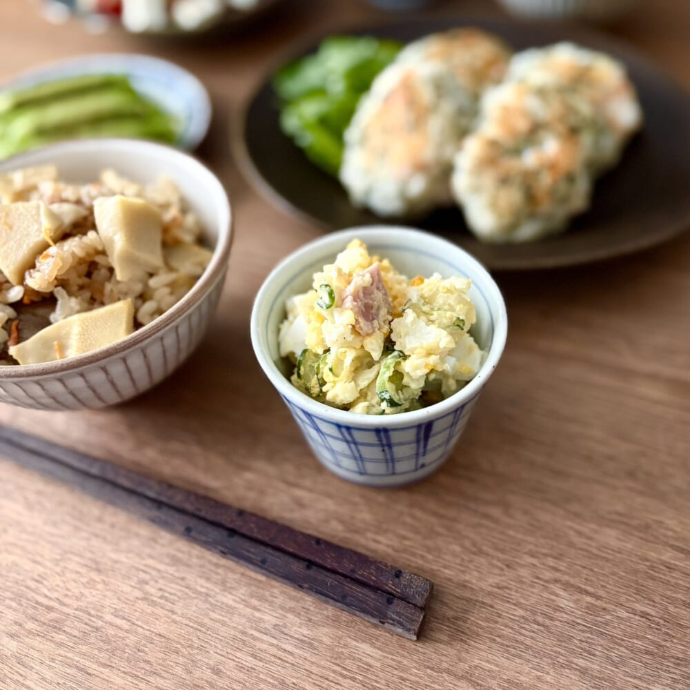 ポテサラも、新じゃがと新玉ねぎを使った春バージョンですね。この日はハムの代わりにカリカリに焼いたベーコンを入れました。