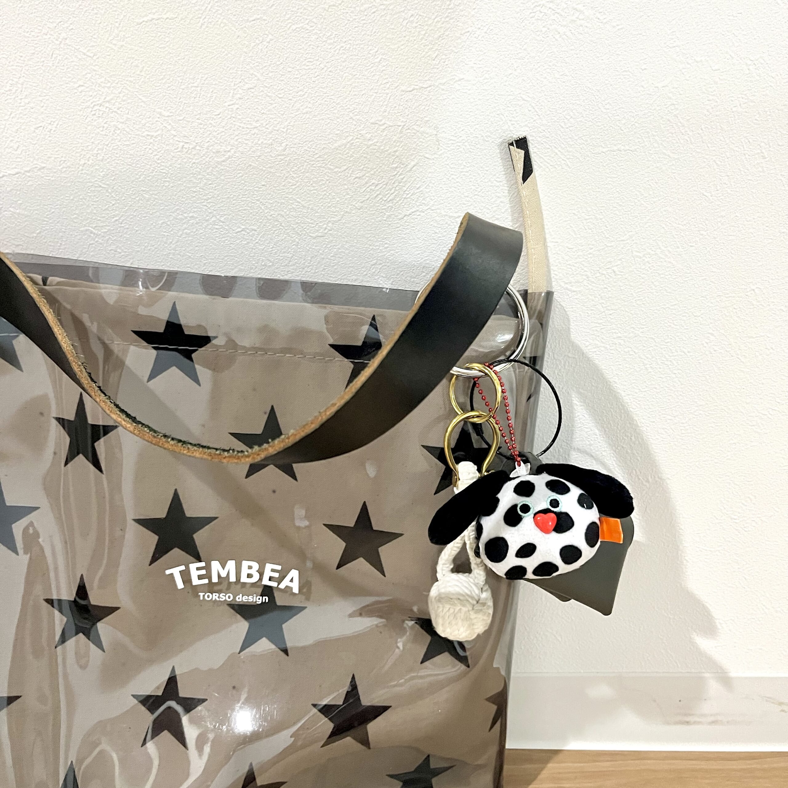 ワンコのマスコットはモノトーンなので革のバッグなどにも合いそうです。今回はテンベアの黒系トートと合わせてみました。