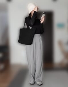 最近のワンマイルコーデ。ユニクロのスラックス風のパンツがウエストゴムで履き心地が良くお気に入りです。