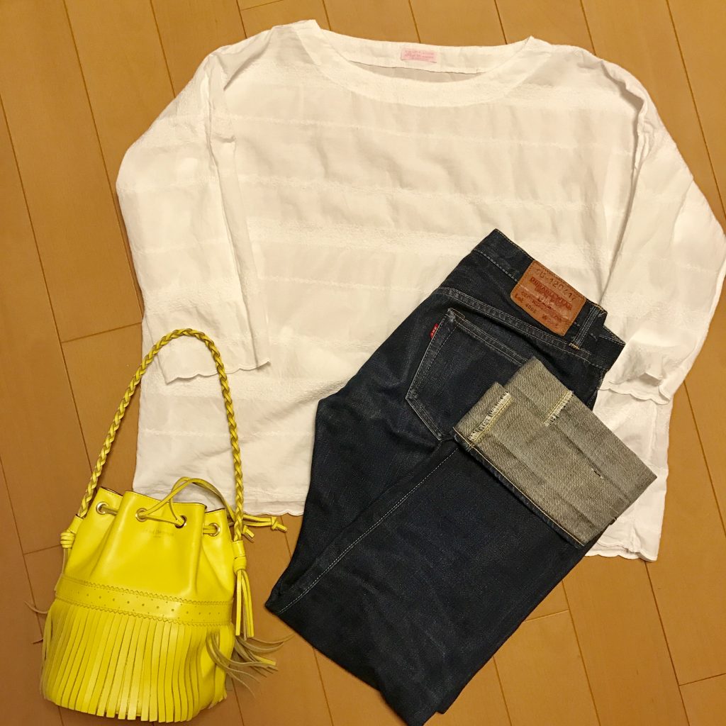 ボリュームのあるトップスとボトムスですが、これもブラウスは薄手でふわっと軽いので、軽い×重いでバランスはとれていたのではないかと。こういう時、ついつい黄色とか入れちゃいがち。。。濃いデニムと黄色ってたまらない組み合わせです。