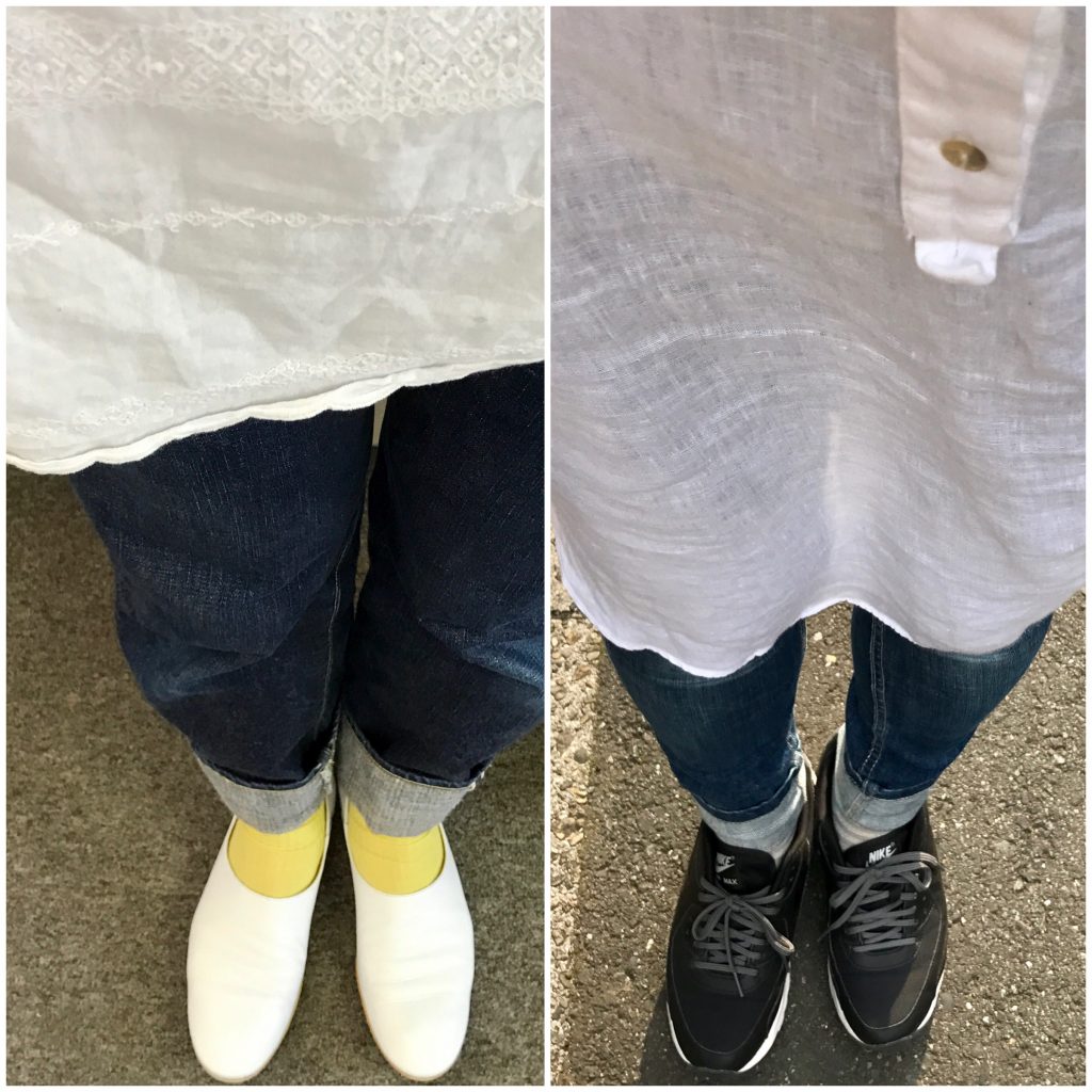 足元は、スキニーにはごついハイテクスニーカーを。太いボリュームデニムにはスラッとしたシンプルなqueの靴を。靴下もタマゴ色にしてしまった!
