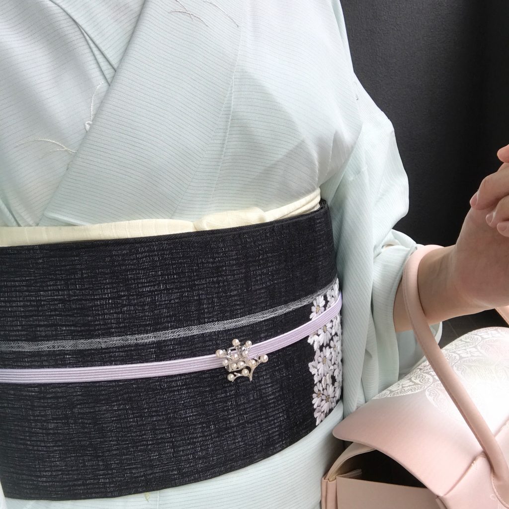 絽の小紋に羅の黒帯、祖母のブローチを帯留めに。