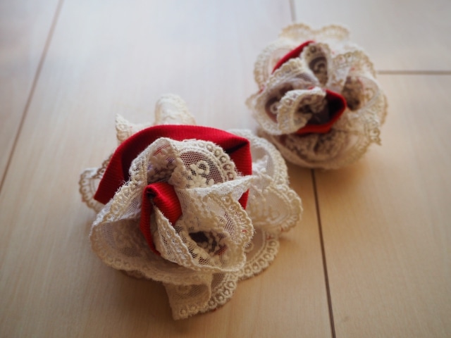 コーデュロイ生地の残りとレースを使ってコサージュも作りました。