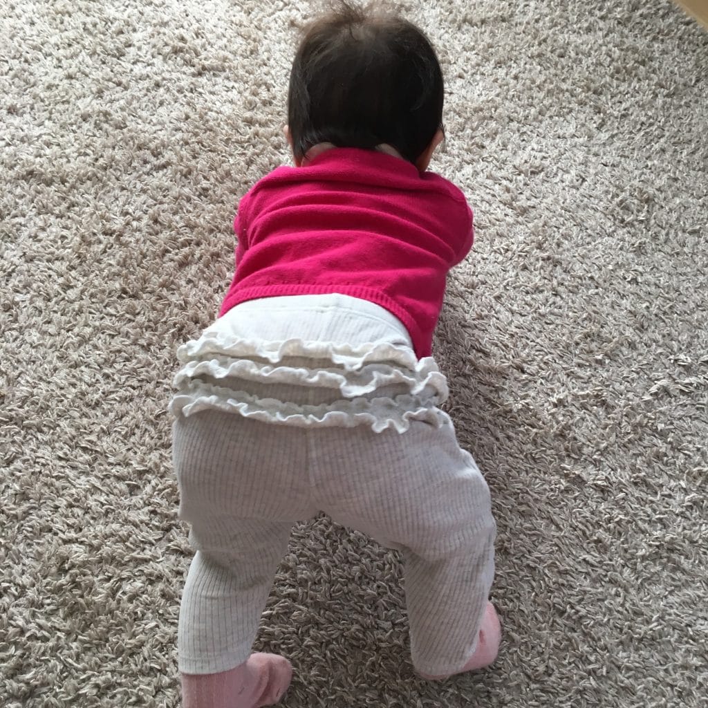 このパンツ、特にフリフリに惹かれたわけではなく、生地が暖かそうだな〜くらいの気持ちで選んだのですが、履かせてみたらプリプリのお尻が強調されるような気がして(笑)可愛くてお気に入りです。