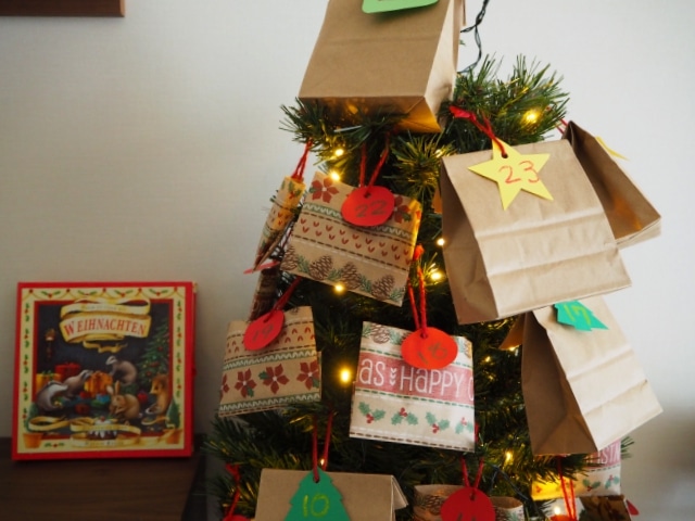 ダイソーの包装紙、ペーパーバッグ、毛糸を使いました。
