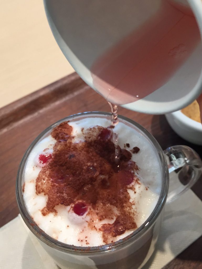 カフェラテにクランベリーの黒酢をかけて頂くホットドリンク。