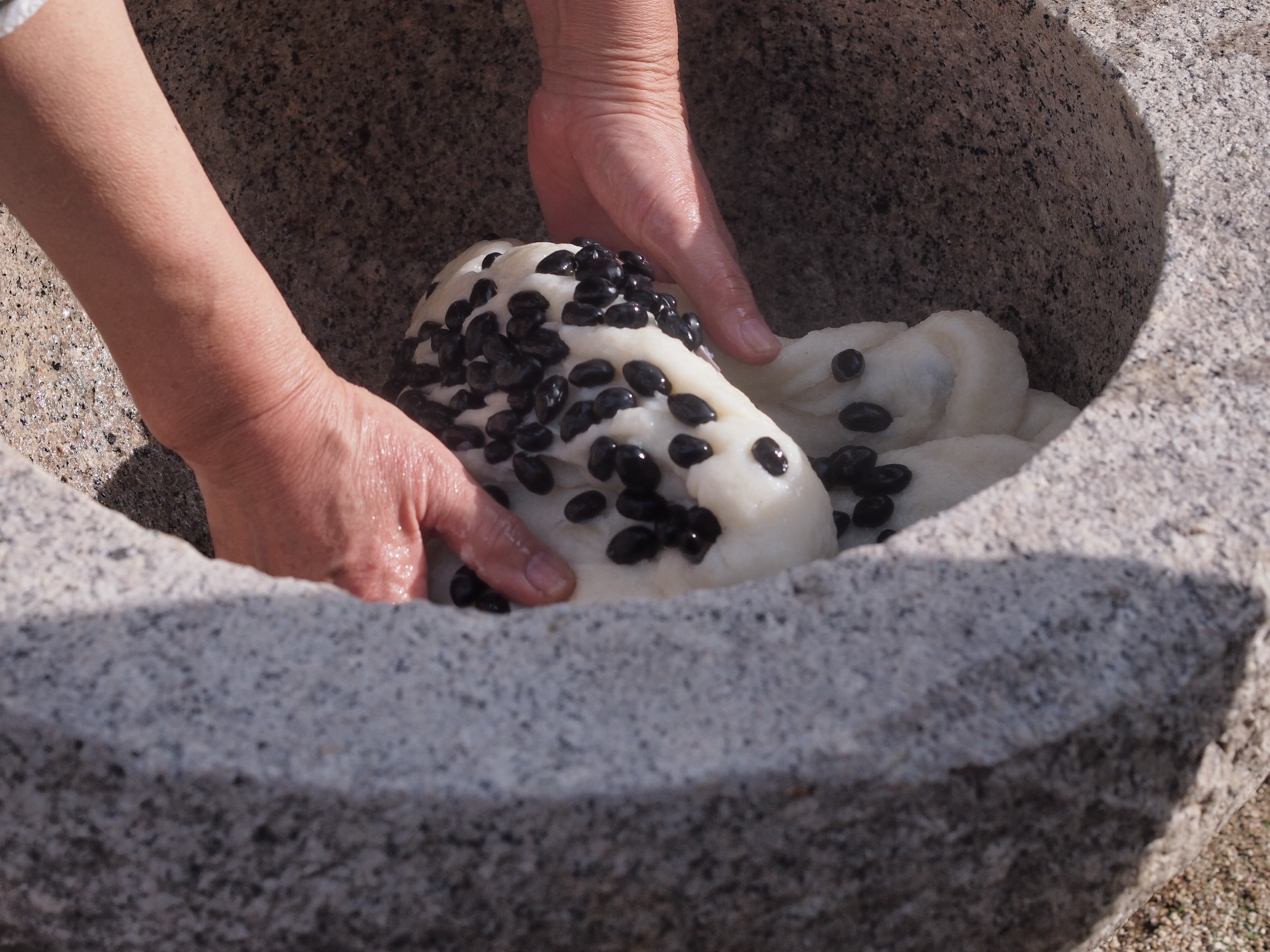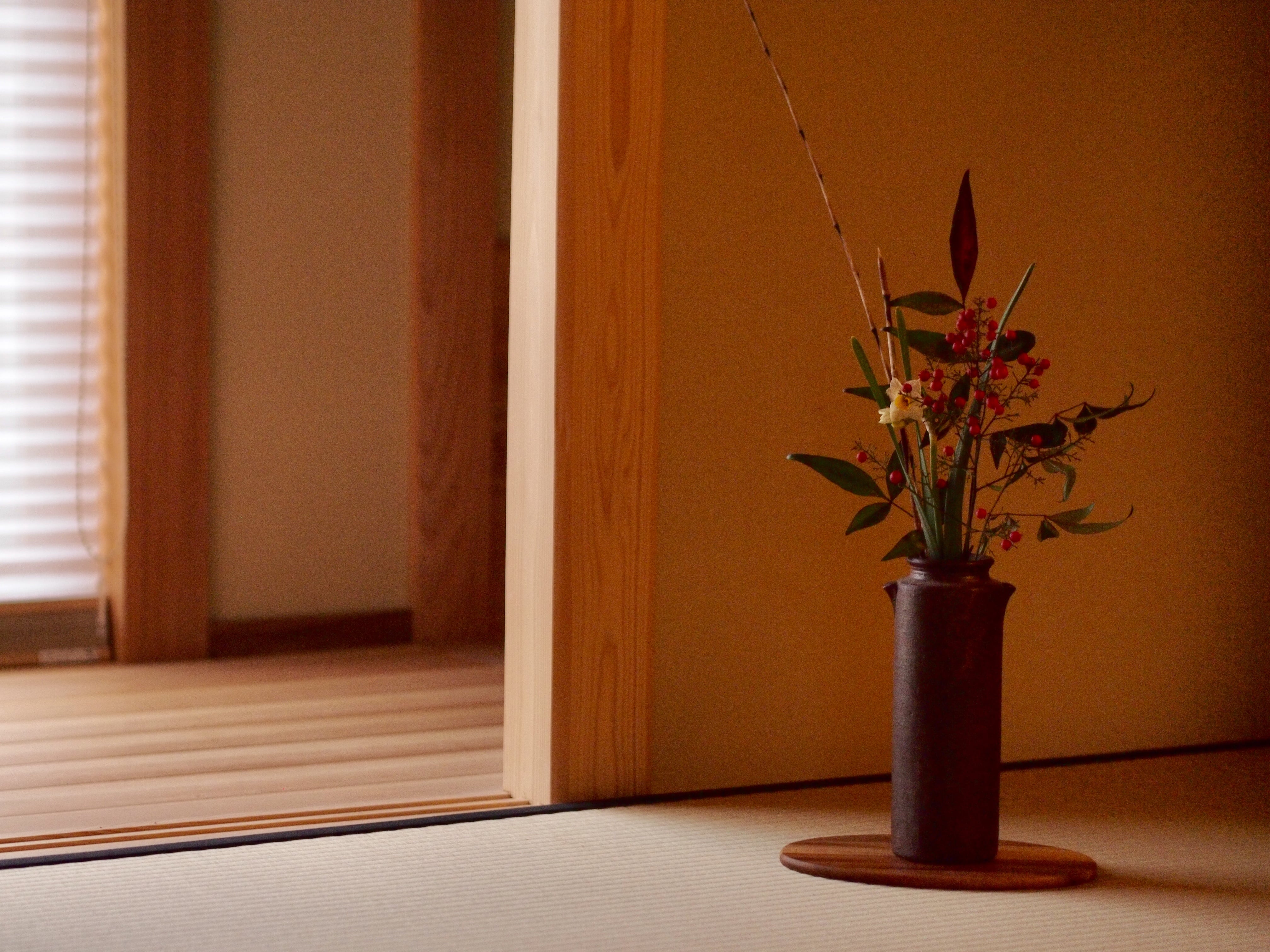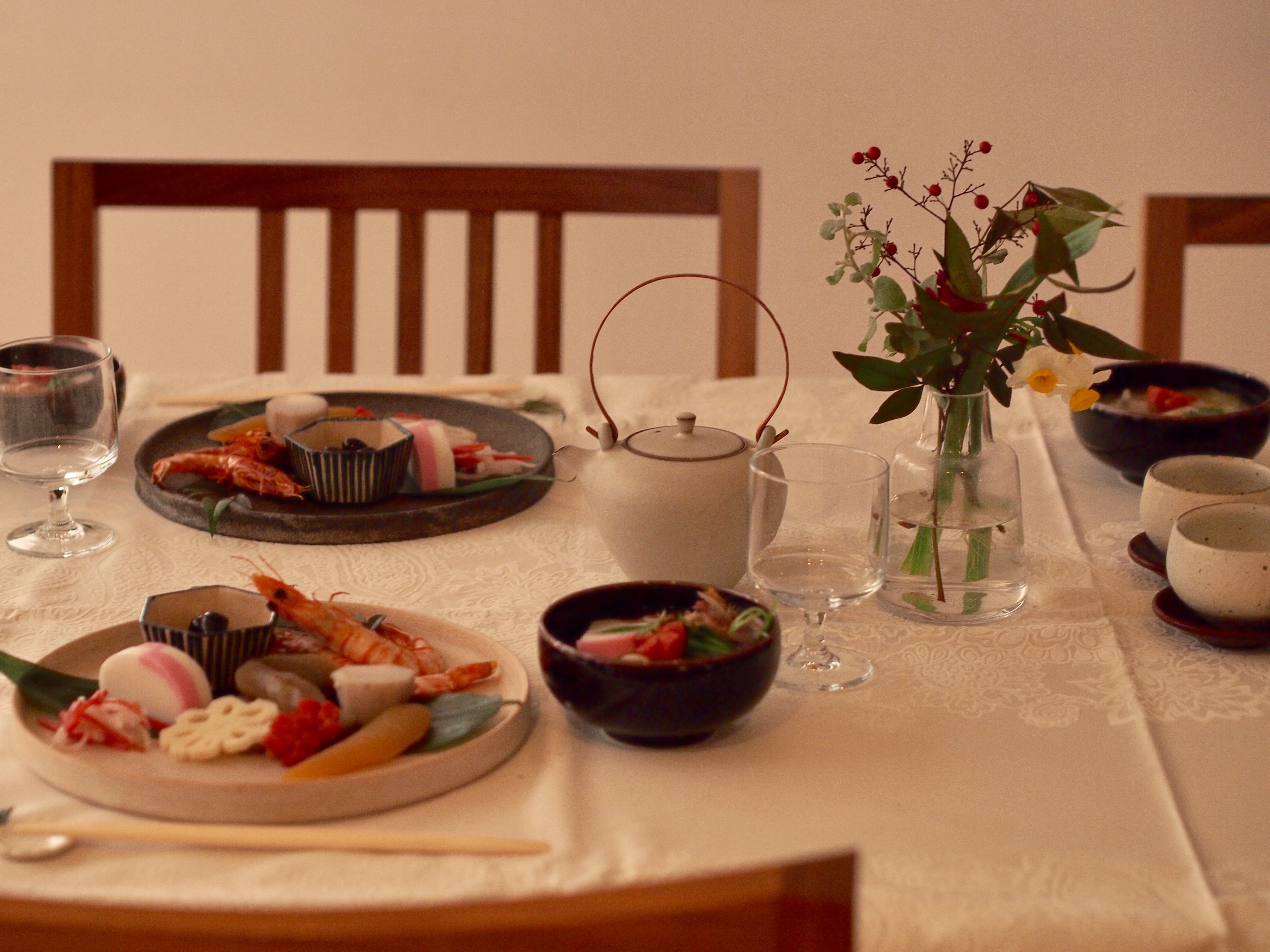 お餅は、年末に友人の町家のもちつきに参加して、自分で丸めたもの。お花は、今年も友人のお花屋さんにお願いしました。