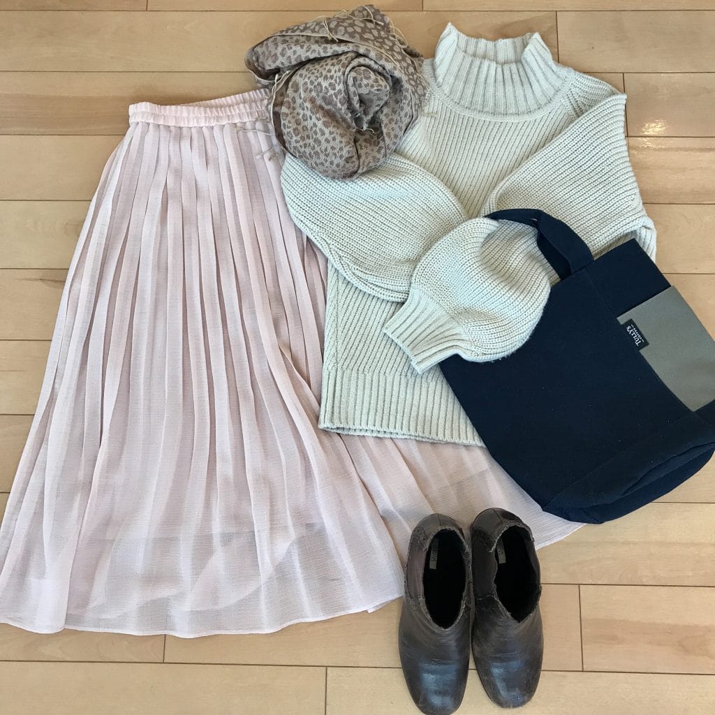 写真に入れていませんが、サイトゴアブーツの色味に合わせて、タイツは無印良品のブラウンで。