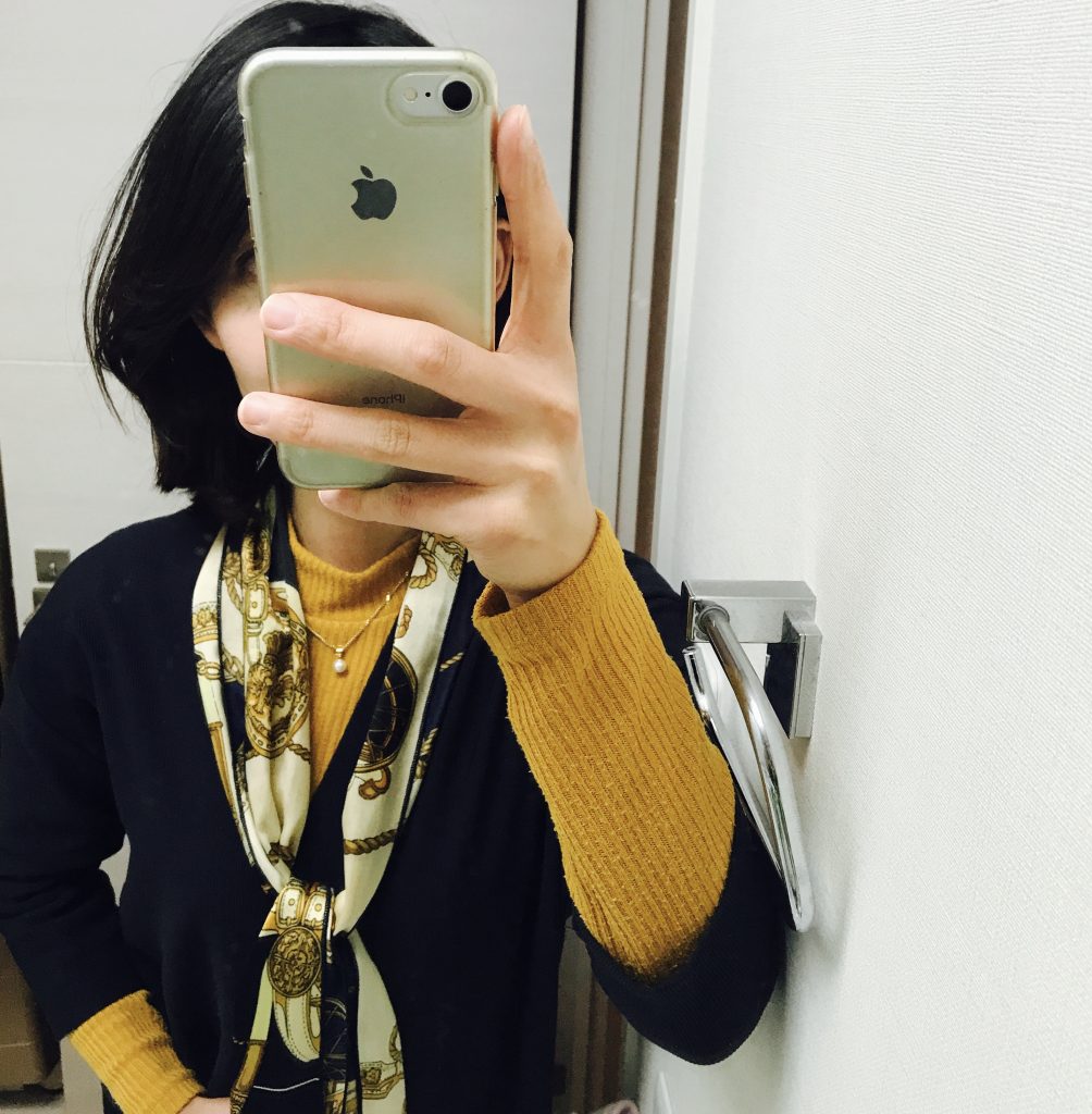 yellowを合わせて、スカーフを。4色どれでもいけるかな?