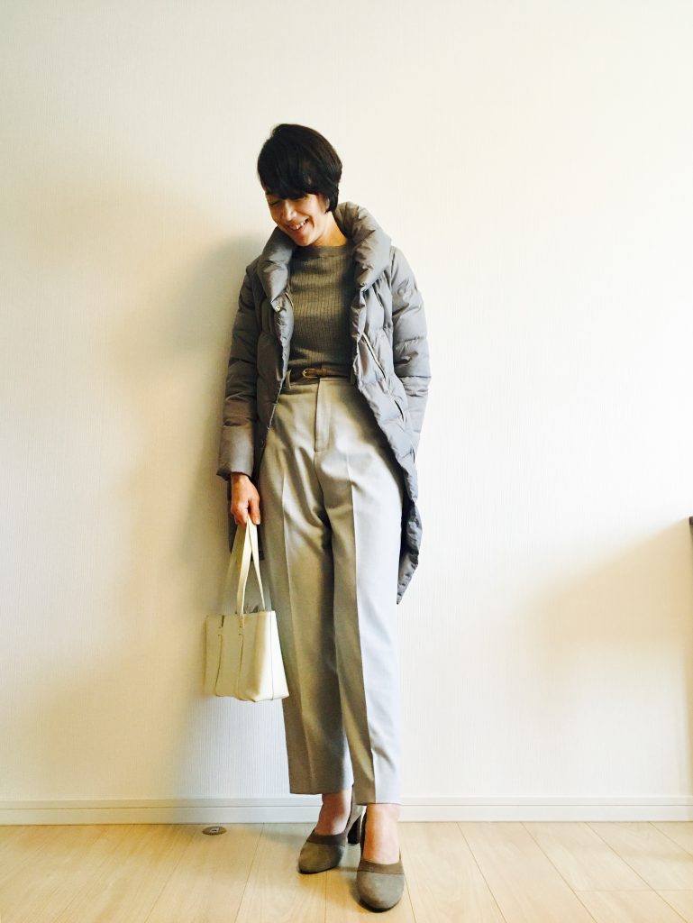 小物以外はグレーですが、アウター、トップス、ボトムスともに微妙に濃淡のある、違った色味のグレーで合わせると、のっぺりせず、スッキリとなりますね。
