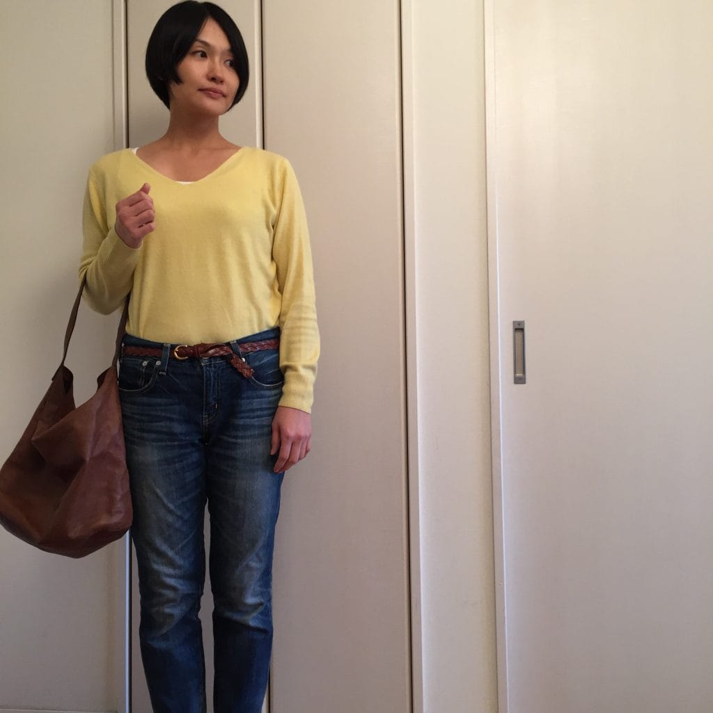 今回はイエローのニットにチャレンジしましたが、他にも色ものを取り入れていけたらなーと思います。