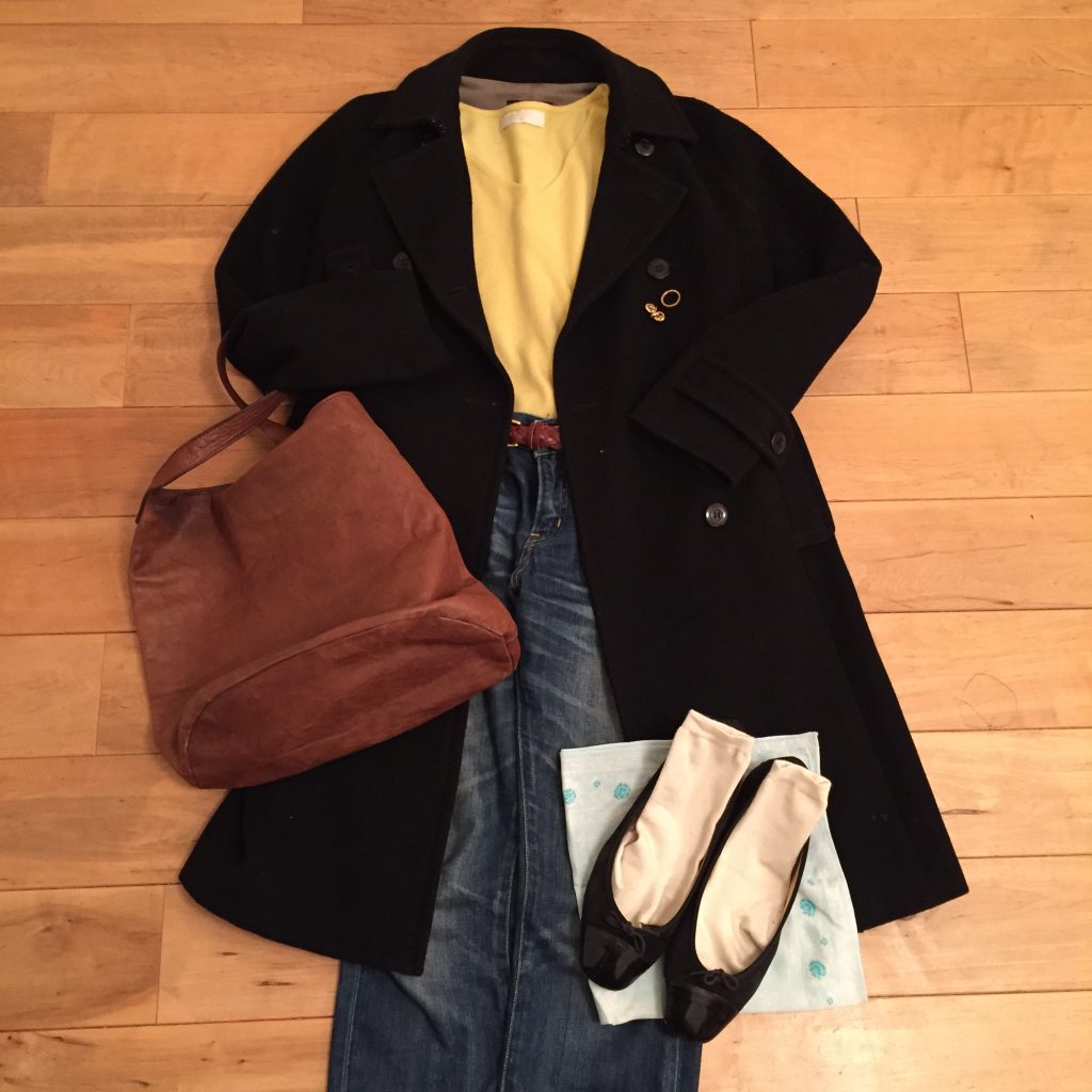 コート/ドゥーズィエム クラス、ニット/Discoat、デニム/RED CARD、バレエシューズ/UNITED ARROWS、バッグ/10年くらい前に二子玉川のKOHOROで買ったもの