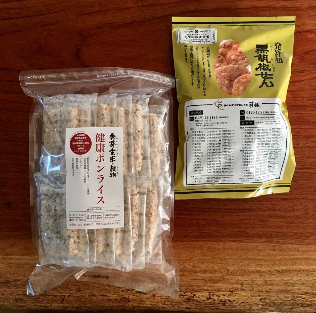 買ったのはこちら、黒胡椒せん(主人のおやつ)と健康ポンライス(息子のおやつ)。