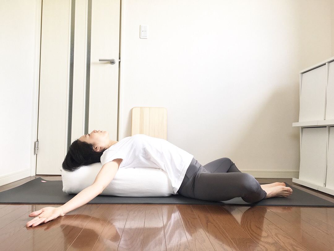 そのままボルスターの上に仰向けに寝て、両腕を開き、