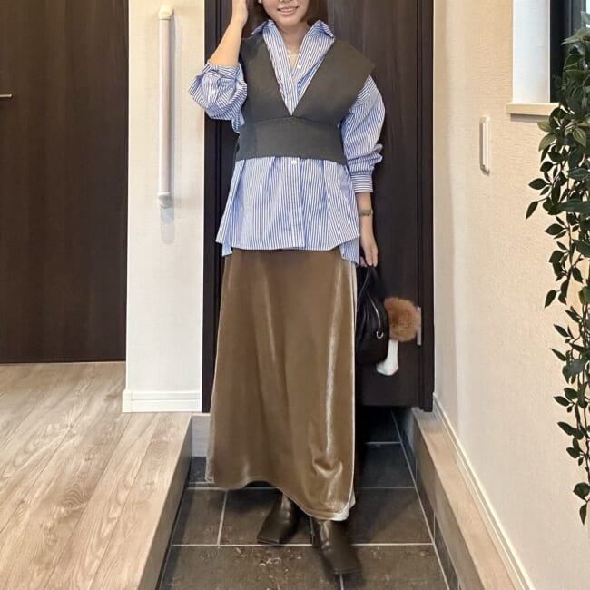 【気温20度 ・30代ママの秋コーデ】ニットビスチェ×シャツ×ベロアスカート