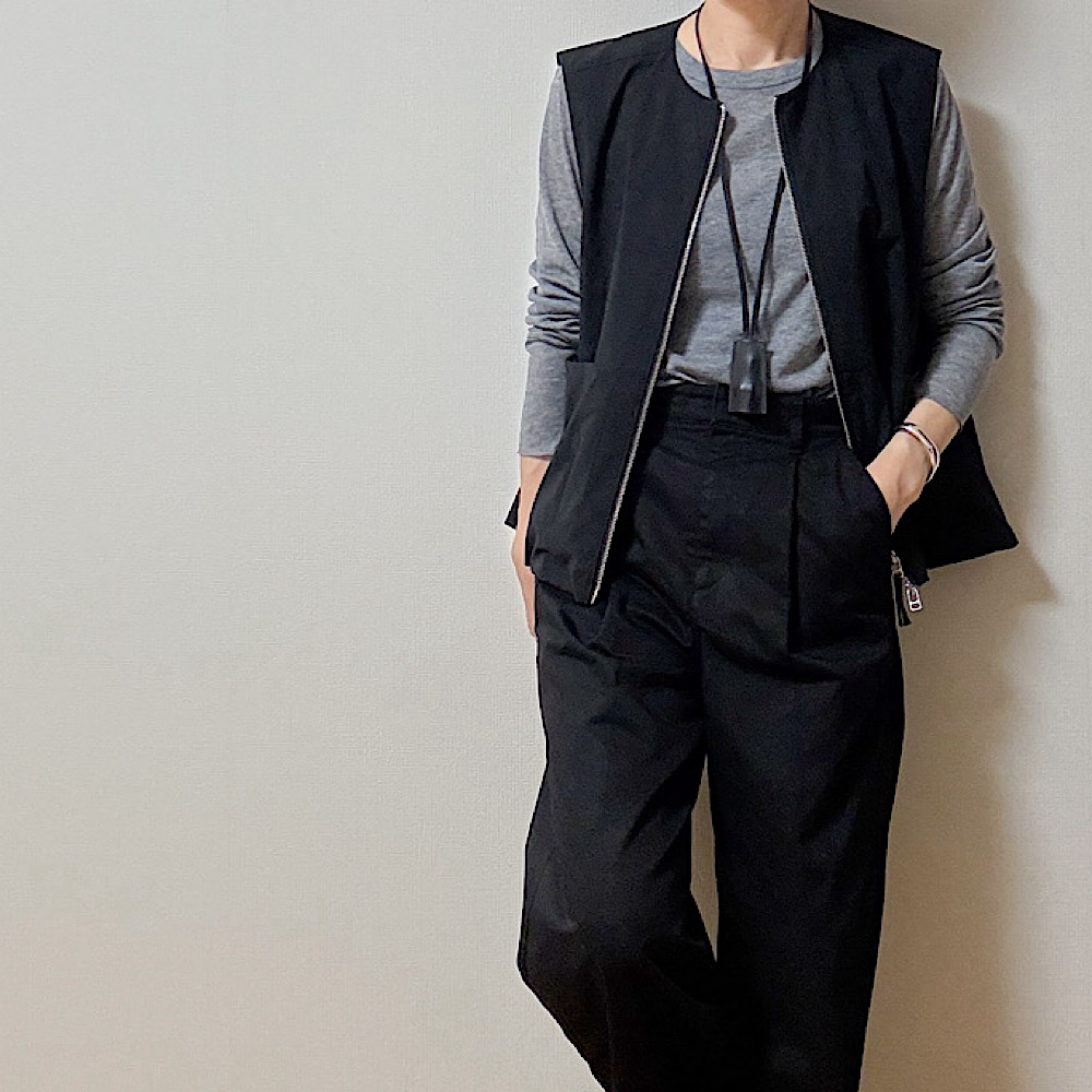 GUの『ソフトシアークルーネックT』とUNIQLOの『リブヘンリーネックT』の組み合わせが可愛いです。