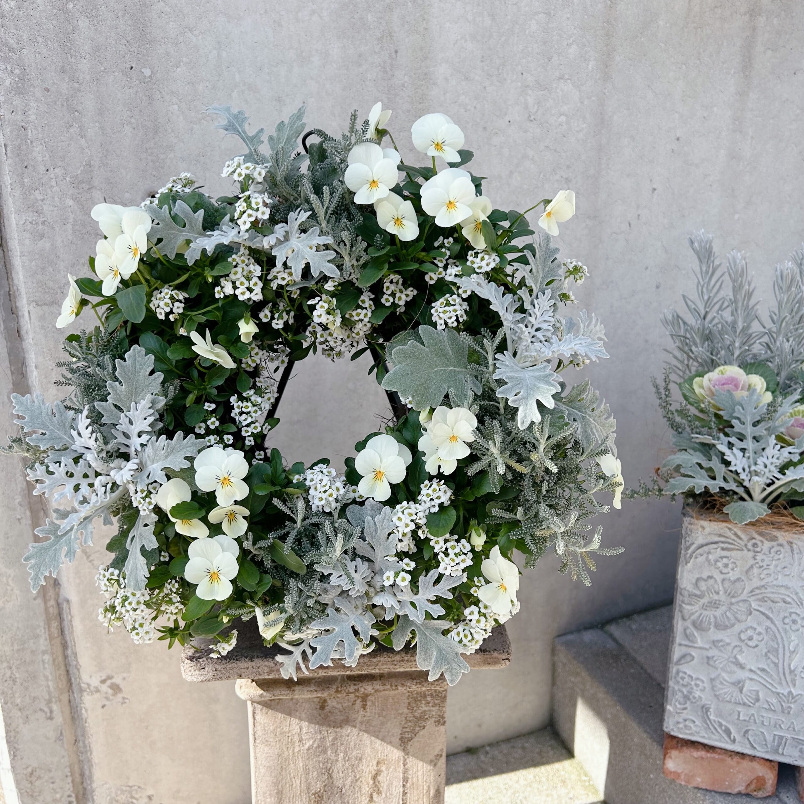 我が家の冬の寄せ植えリース。今年はホワイト系に。