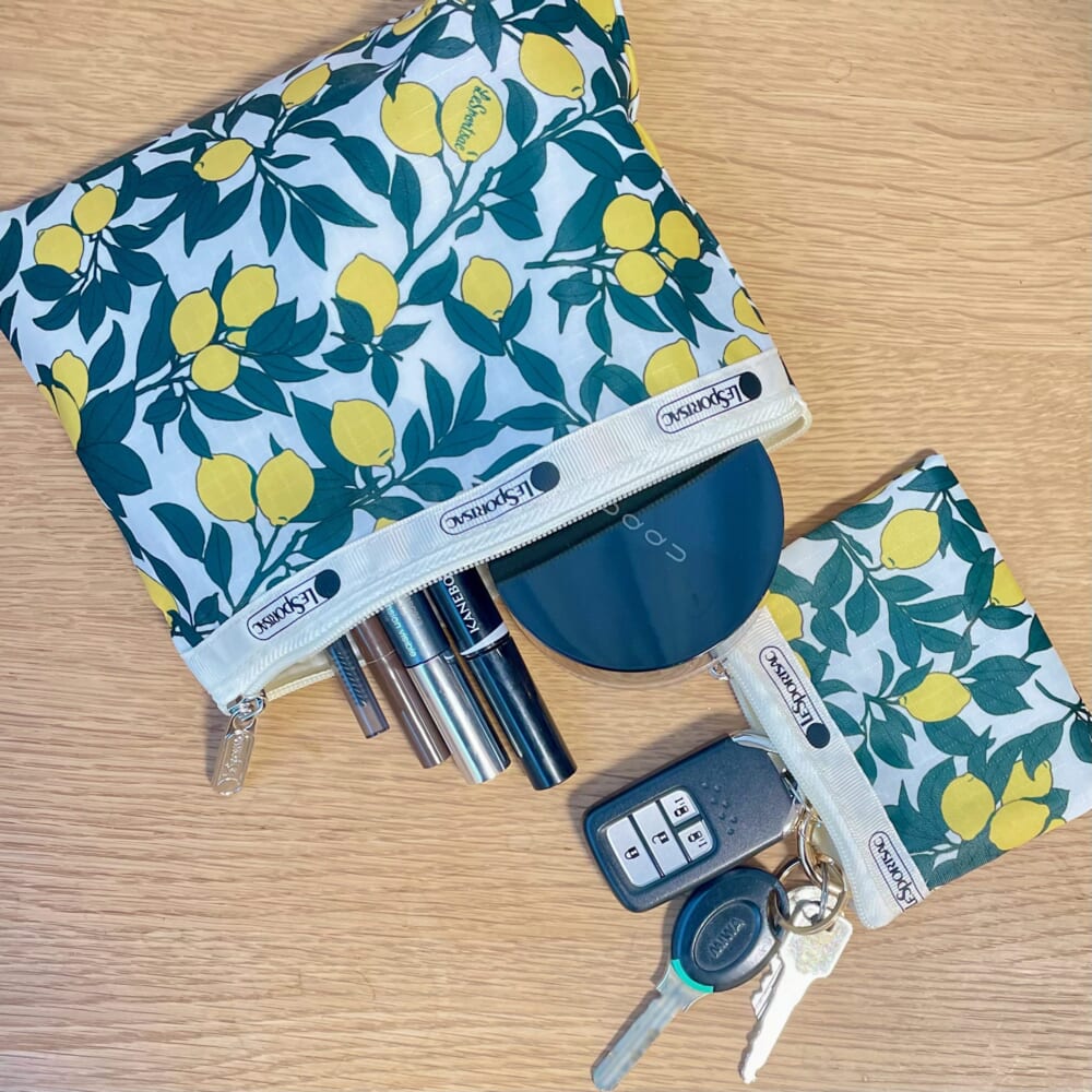レスポートサックのレモン柄ポーチ、早速メイクポーチとキーケースに。【LEE4月号特別付録】