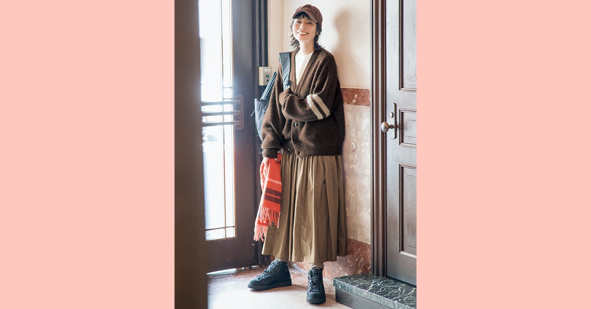 旬のブラウンカーディガン+ボリュームスカート。鉄板コーデの最新はトラッドが気分!/明日なに着る?