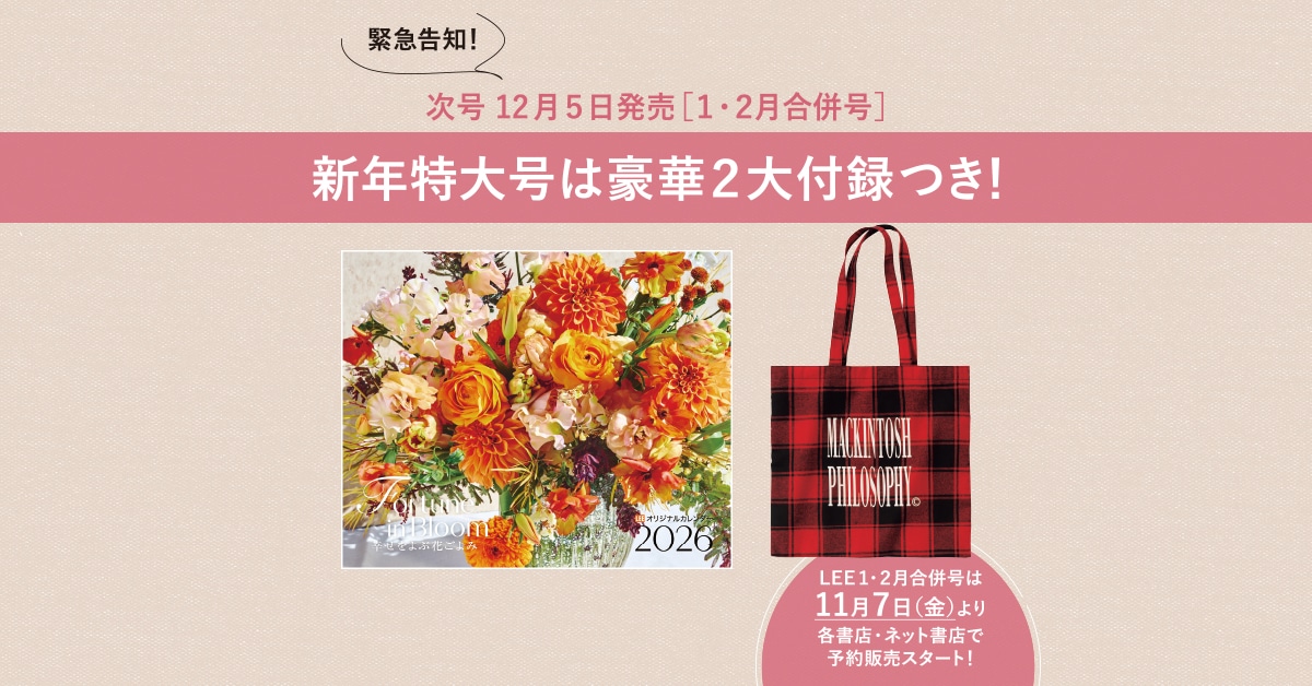 【LEE2026年1・2月合併号は豪華2大付録つき】毎年大好評!「花のカレンダー」&ますます可愛い!「マッキントッシュ フィロソフィー 大人のチェック柄BIGトート」【予約販売スタート!】