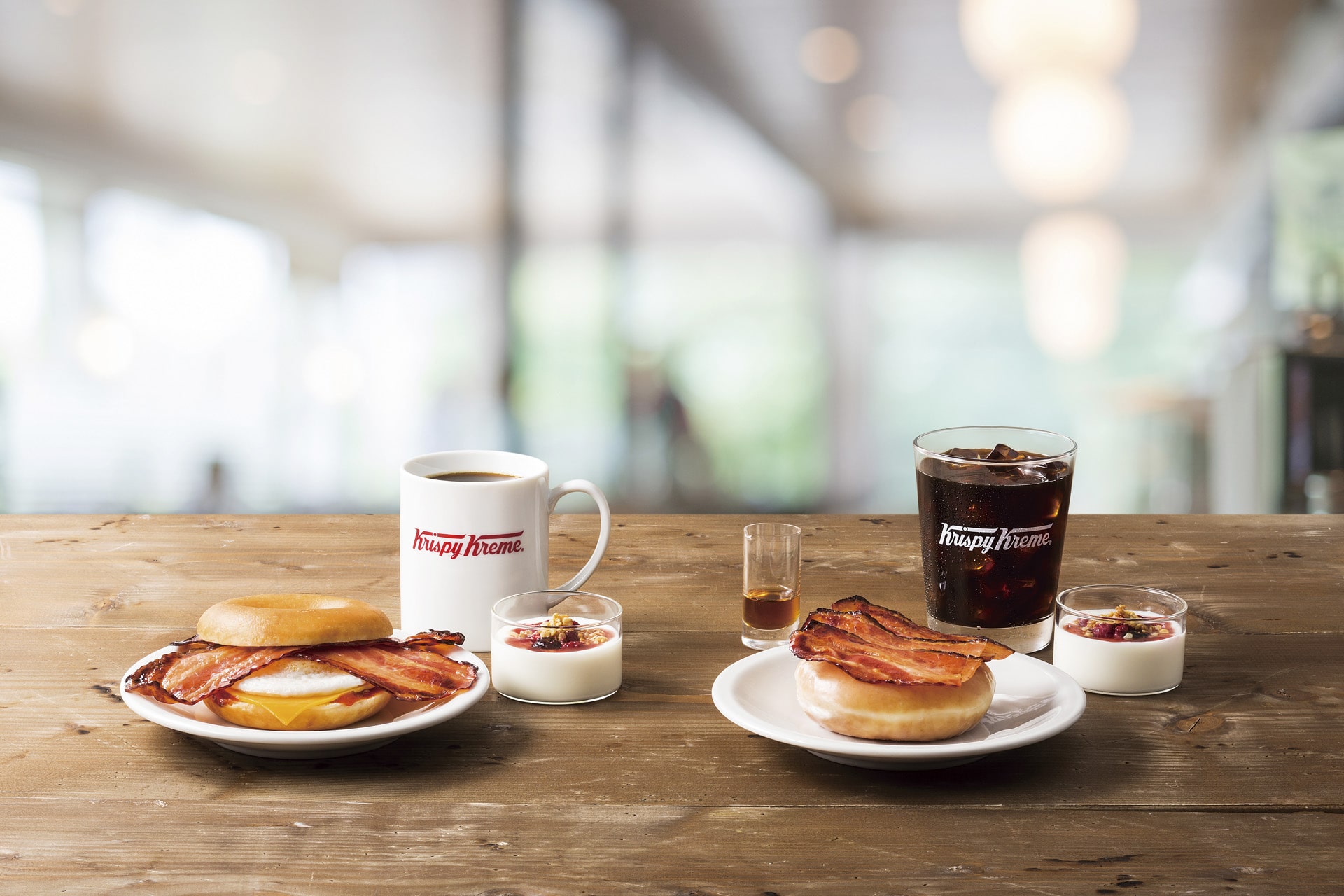 朝食メニューとして、アメリカではなじみ深い「甘い」×「しょっぱい」のハーモニーが新鮮な「メープル ベーコン グレーズド」と、シンプルなドーナツにカリッと香ばしいベーコン、目玉焼きをサンドした「ドーナツバーガー」がモーニング限定セットとして登場!