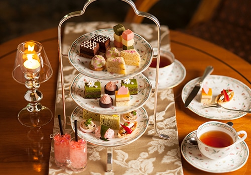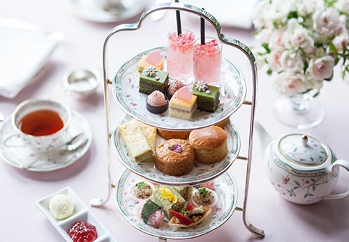 英国式アフタヌーンティーに、桜舞う風情の「和」を取り入れたスイーツやサンドウィッチが楽しめます。