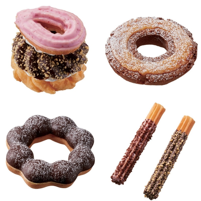 左上【北海道】チュロフレンチ(194円)、右上【東京・関東】焼きカスタードファッション(129円)、右下【中四国】ボニートチュロ(151円)、左下【近畿】ポン・デ・エクレア(140円)。(※価格は税込みです)