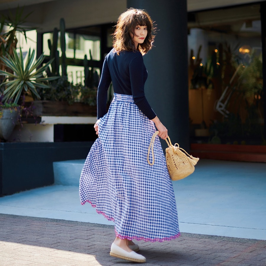 白アイテムに勝る清潔感が手に入るのが、青い空や青い海を連想させるクリアなブルー。旬柄でもあるギンガムチェックのブルーのスカートが、ベーシックなネイビーニットをさわやかに盛り上げて。ブルーは色幅が広いカラーでもあるから、今シーズンならきっと、お気に入りの一枚が見つかるはずです。