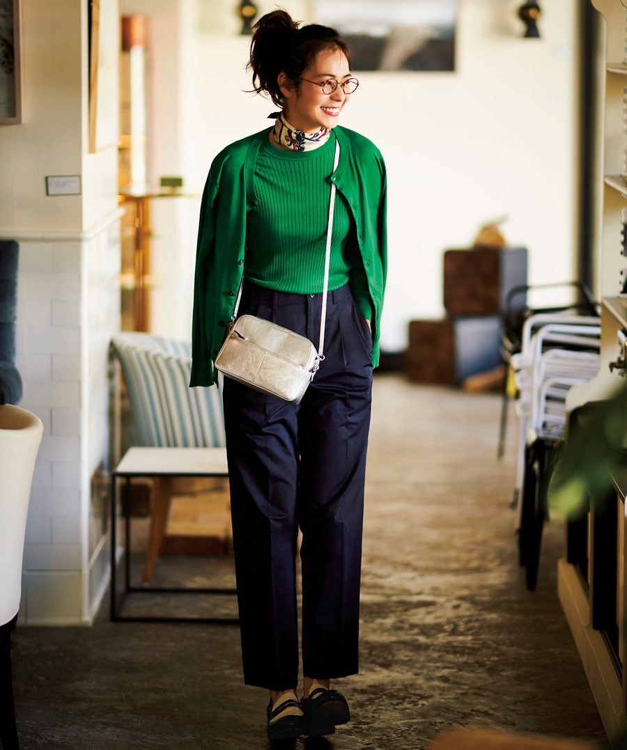 いつもならネイビーのツインニットで、上品かつシックなワントーンコーデを楽しむところを、この春は思いきってグリーンにチェンジ。知的さと新鮮さが同時に手に入ります。