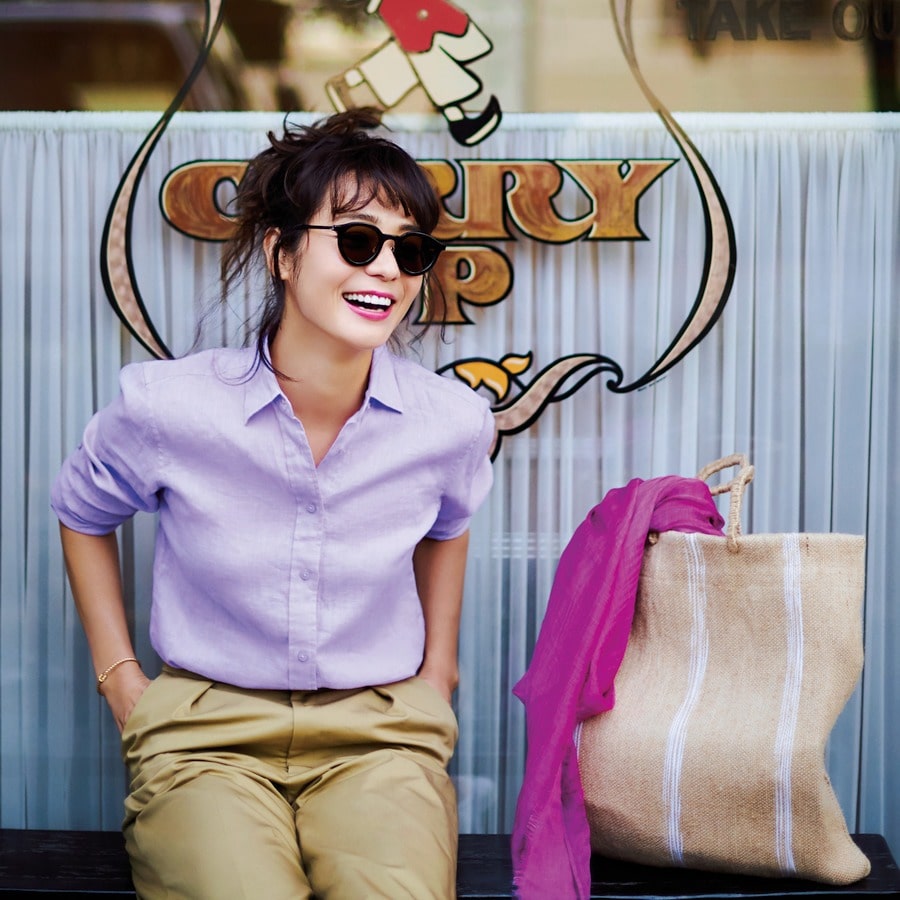 シャツ¥13000/ラルフ ローレン(ローレン ラルフ ローレン) パンツ¥14000/ピーチ(ミューニック) サングラス¥47000/アイヴァン 7285 トウキョウ(アイヴァン 7285) バングル¥5000/ココシュニック オンキッチュ 有楽町マルイ店(ヨキ) バッグ¥9500/ギャルリー・ヴィー 丸の内店(ギャルリー・ヴィー) バッグの中のストール¥27000/リフラティ シップス たまプラーザ テラス店(ファリエロ サルティ)
