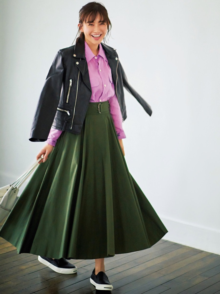 シャツ¥47000/エストネーション(マディソンブルー)スカート(共布ベルト付き)¥35000/インターリブ(サクラ) ライダース¥88000/ゲストリスト(アッパーハイツ) バッグ¥154000/J&M デヴィッドソン 青山店(J&M デヴィッドソン) 靴¥14000/ビオトープ(コンバース フォー ビオトープ)