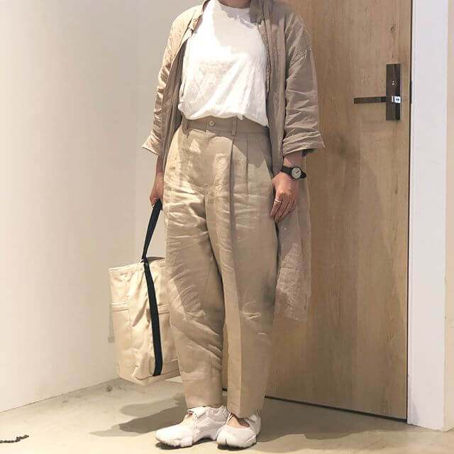 夏の着こなしはとにかく風通しがよくて楽ちん?がモットーなので、2枚目画像のような薄手のリネンコート×ワイドパンツのようなゆるゆるコーデが多いのですが、適度に足の甲が出るデザインなので、全身にほどよい抜け感を出せるのが優秀なんです?
