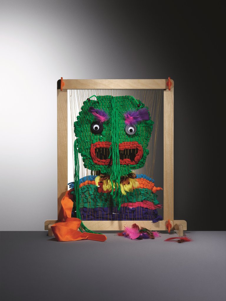小型はたおり機と4色のリボンのセット。毛糸、レース、タイプの違うリボン、どれもこのはたおり機にかけられます。