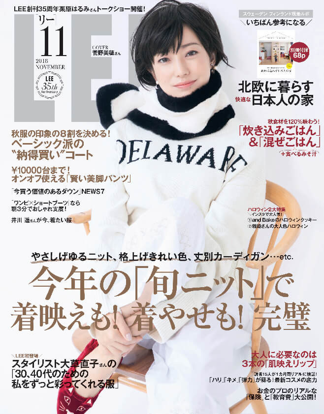 こんにちは、編集長の崎谷です。ここのところ、めっきり秋らしくなってきましたね。おしゃれの楽しい季節になりました。今月は、秋おしゃれの主役「ニット」が巻頭特集です。インテリアでは、なんと68ページの別冊付録「北欧で暮らす日本人の家」。日本人のフィルターを通した快適に暮らすためのアイデアを徹底取材、参考になること間違いなしの自信作です。スウェーデン・フィンランド、オール現地ルポでお届けします。また、スタイリスト大草直子さんがLEE初登場! これからのLEE世代へ向けて「30代40代と迷わずおしゃれを楽しめる」アドバイス満載、目から鱗の16ページ大特集です。超盛りだくさんで必見の11月号、それではご紹介させていただきます。