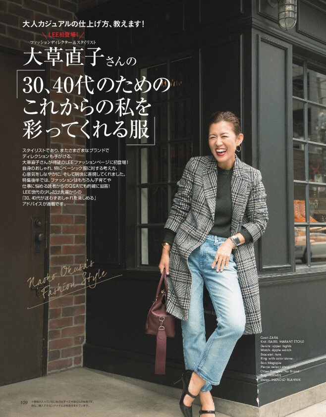 スタイリストであり、またさまざまなブランドでディレクションも手がける、大草直子さんがLEEファッションページに待望の初登場! ご自身のおしゃれ、特にベーシック服に対する考え方、心意気を、しなやかにまた明快に表現してくれました。後半では、ファッションはもちろん、子育てや仕事に悩める読者からのQ&Aにも回答。LEE世代の少しだけ先輩からの「30、40代を迷わずおしゃれを楽しんでいける」アドバイスが満載です。