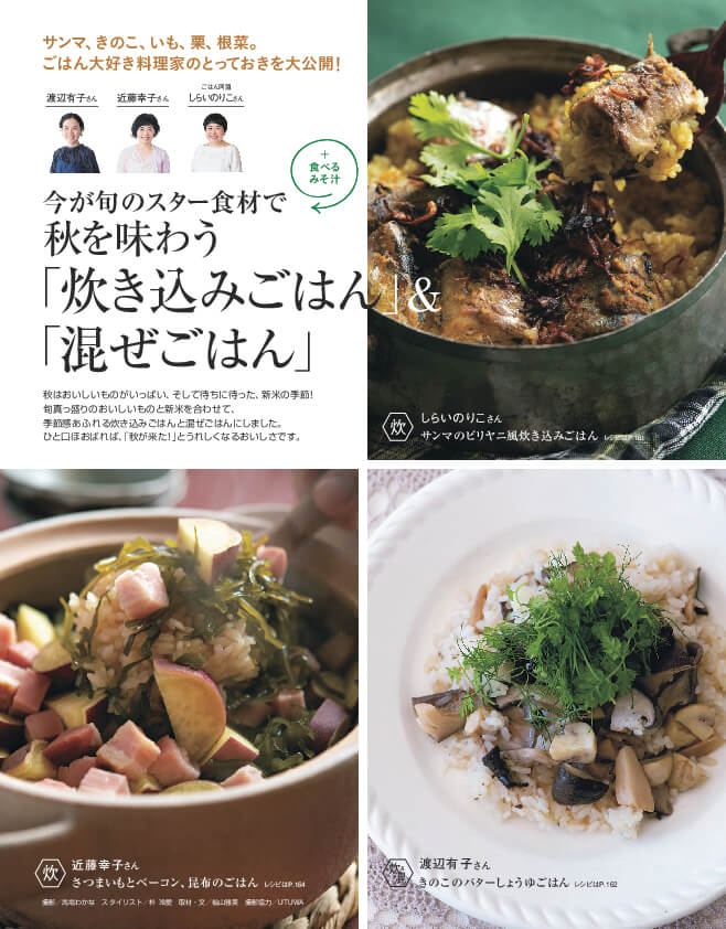 秋は美味しいものがいっぱい、そして待ちに待った、新米の季節! 旬真っ盛りの美味しいものと新米を合わせて、季節感あふれる炊き込みごはんと混ぜごはんにしました。サンマ、きのこ、芋、栗、根菜。渡辺有子さん・近藤幸子さん・しらいのりこさん…ごはん大好き料理家のとっておきを大公開。ひと口ほおばれば、「秋が来た!」と嬉しくなる美味しさです。おまけに、炊きたてご飯に合う「食べるみそ汁」、美味しい白ごはんの炊き方まで教えちゃいますよ。
