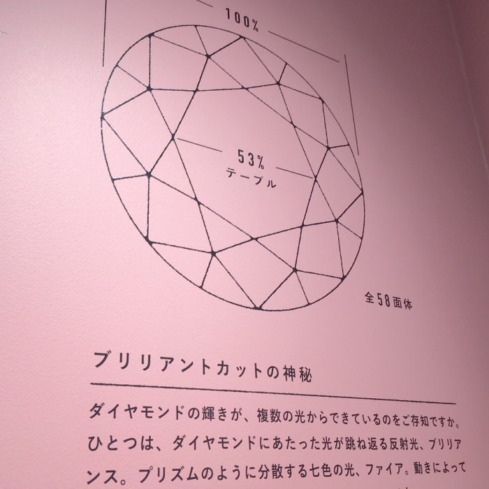 壁には、ブリリアントカットの秘密が描かれています。ウォールアートとしても素敵だし、店内にいるだけで、ちょっとしたアート展に来たような気分。