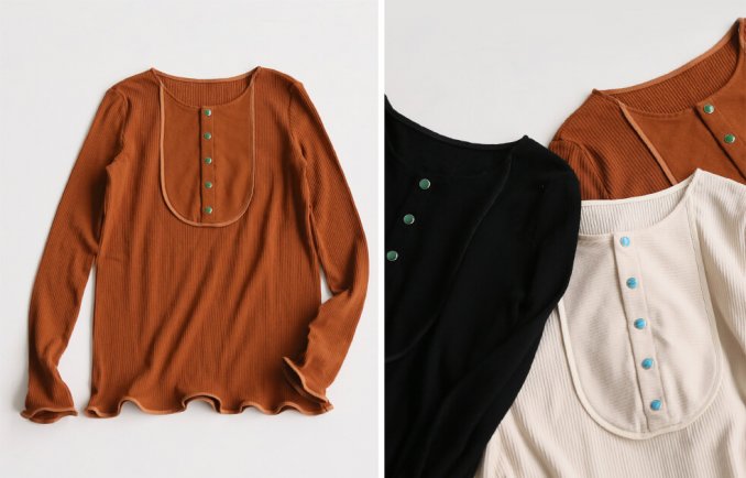 ディテールに動きがあることで、一枚で着てもさり気なくニュアンスが出るカットソー。胸元にU時にあしらったパイピングをボディと同系色にまとめ、スナップボタンはアクセントになるような意外性のある色で、遊び心がプラスされています。