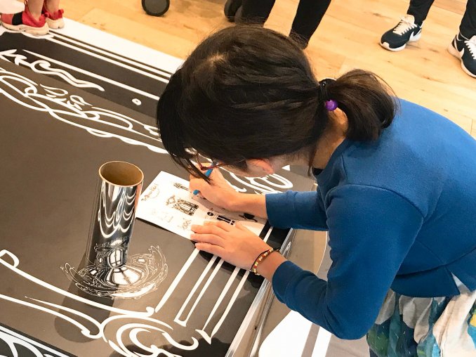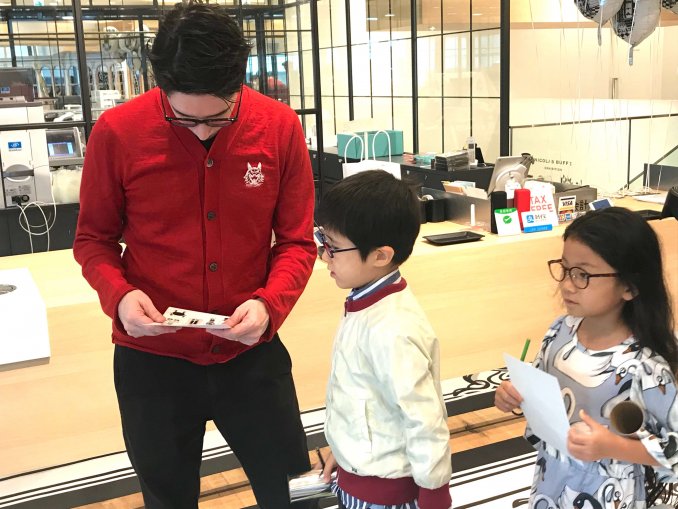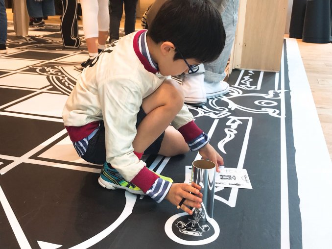 まず子どもたちは、紙に描かれたイラストと同じものを、店内のアートの中から探し出します。いっけん簡単そうに見えますが、一緒に渡された銀の筒を使わないと、発見できない仕組みに……! よーいスタートの合図で元気よく探しはじめます。