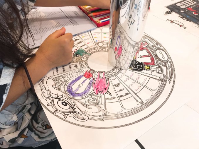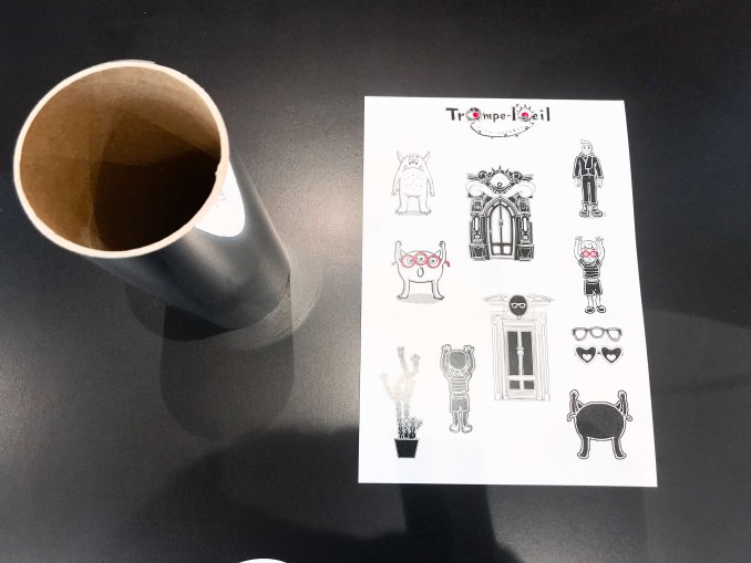 次は、今回の舞台である「モンスターのめがね屋さん」の塗り絵です。少し歪んでみえるイラストですが、先ほど使った銀の筒を真ん中に置くと、正確なイラストに見えるようになっています。