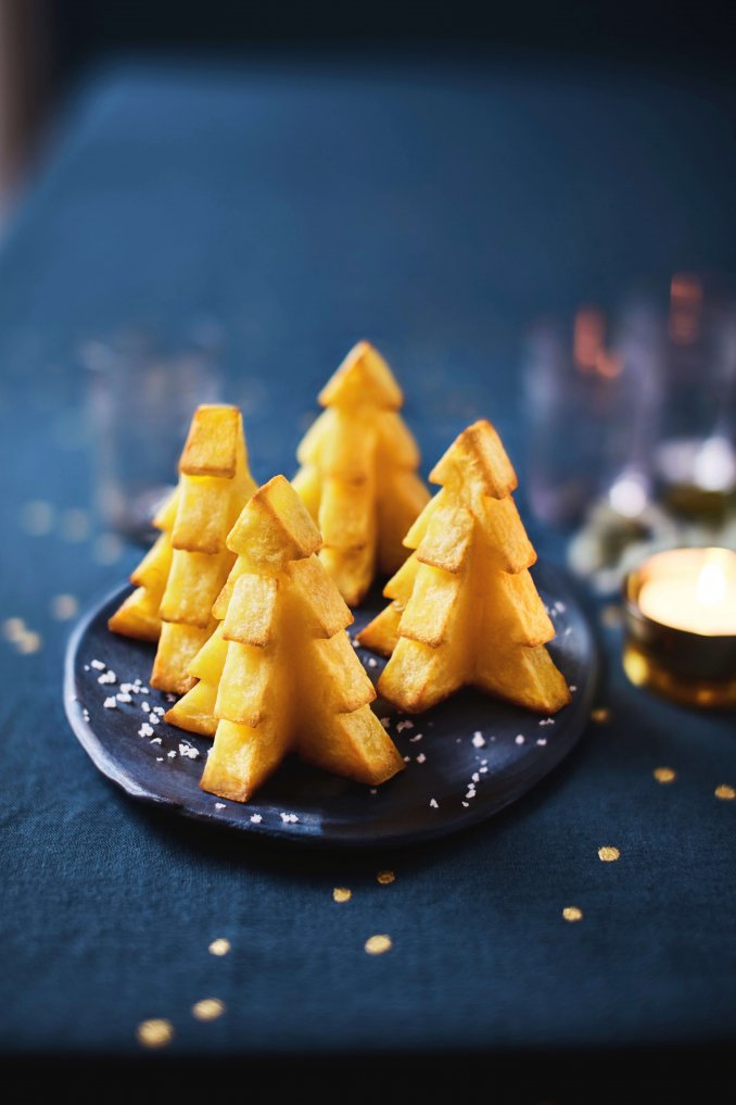 「小さなモミの木(ジャガイモの付け合せ)」は、組み立てると立体的なモミの木の形になるマッシュポテト。オリーブオイル、ゲランドの塩と黒こしょうで仕上げています。可愛らしいフォルムに子どもが喜ぶこと間違いなし!