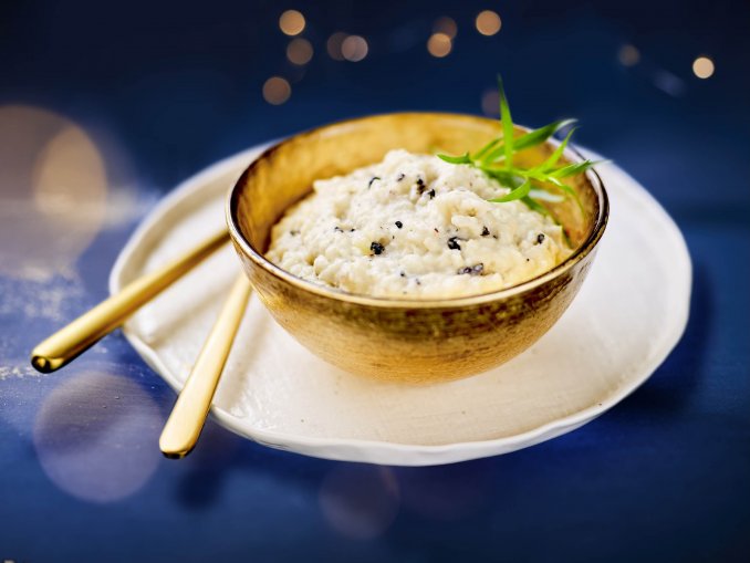 肉料理や鴨料理にぴったりな付け合せ、「根セロリ、ジャガイモ、菊芋、 トリュフのエクラゼ(粗つぶし)」。根セロリのすっきりした風味と、トリュフの香りが楽しめる、ジャガイモのエクラゼとは一味違った上品なおいしさが楽しめます。
