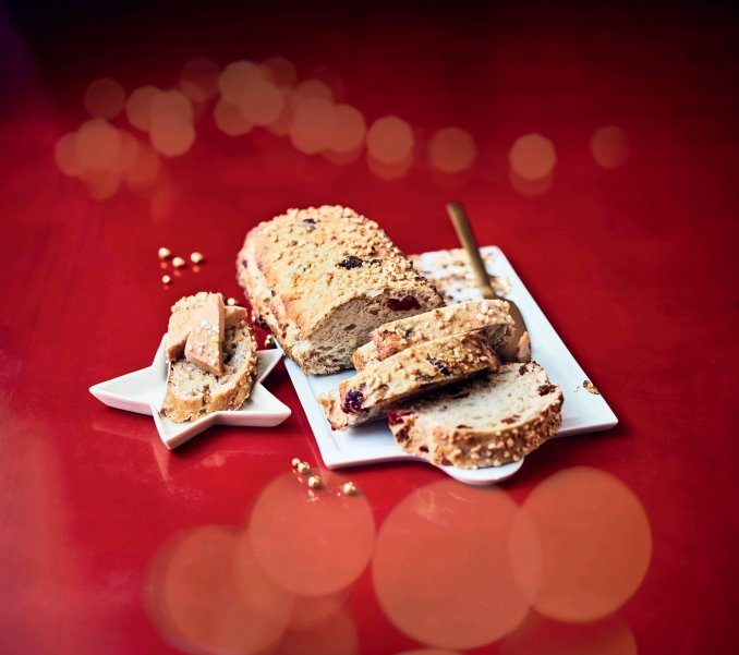 「ミューズリーパン」は、クラストにはヘーゼルナッツを、生地にはシリアルや3種類のドライフルーツを練りこんだお食事パンです。外はカリカリ、中はふんわりしっとりとした食感が特徴で、ほんのり甘さもあります。フォアグラやマグレドカナールなどの付け合せとしてもぴったり!