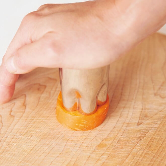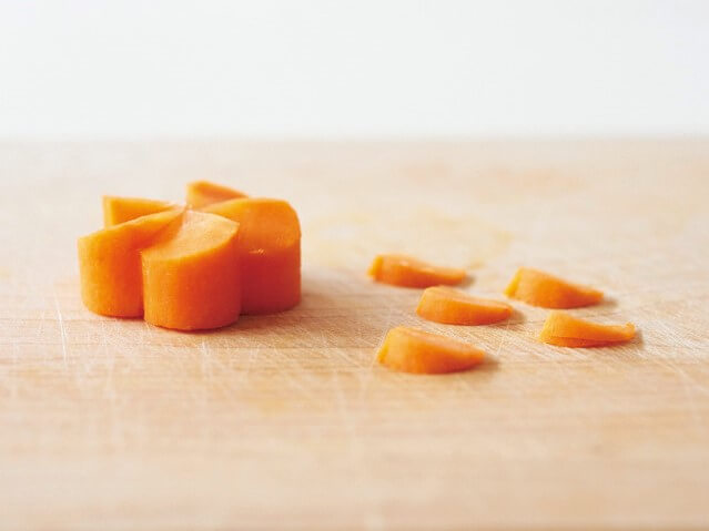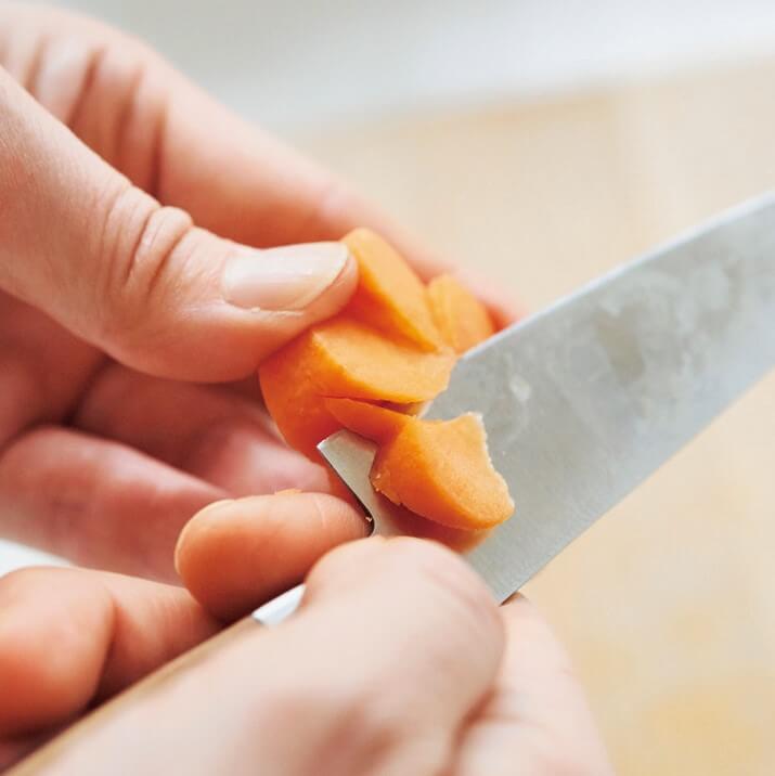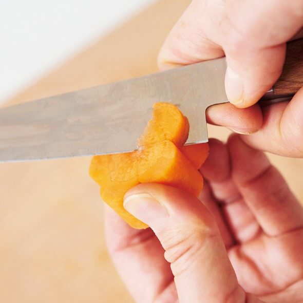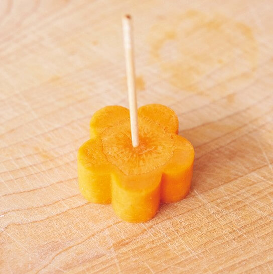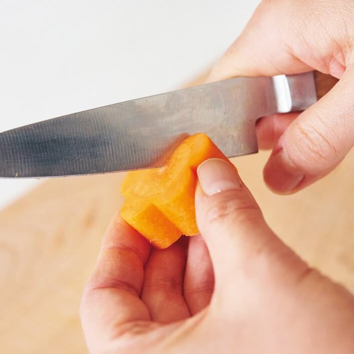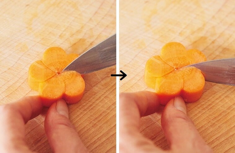 薄いと途中で割れやすく、作業がしづらいので、にんじんの厚さは1.5cmを目安に。