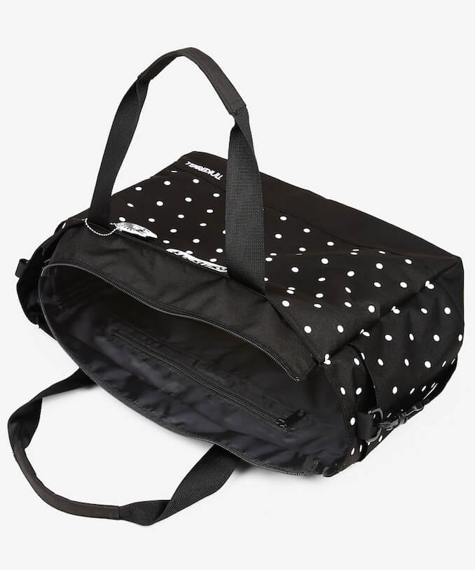 たっぷりと収納ができるので、ちょっとした旅行にも最適なトートバッグは、落ち着いたドット柄がキュート! 肩掛け、斜め掛けにもできる嬉しい2WAYタイプです。