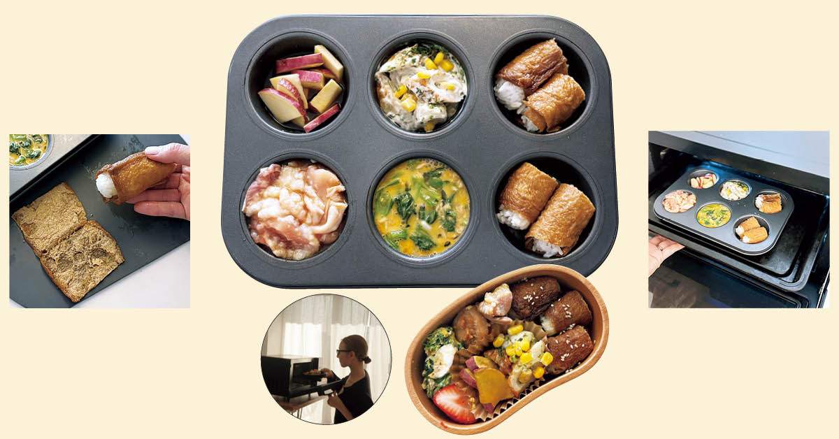 【バズったお弁当レシピ】マフィン型 × オーブン調理で最大6品を一気に!インスタグラマーおさくさんの「焼きおいなりさんといろいろおかず弁当」