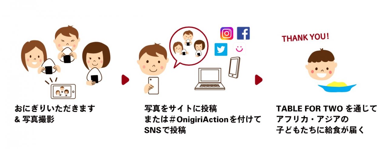 おにぎりを撮影した写真に「#OnigiriAction」をつけて、SNSまたは特設サイトに投稿すると、協賛企業から「TABLE FOR TWO International」を通じて、アフリカやアジアの子どもたちに給食5食分に相当する100円が寄付される仕組み。