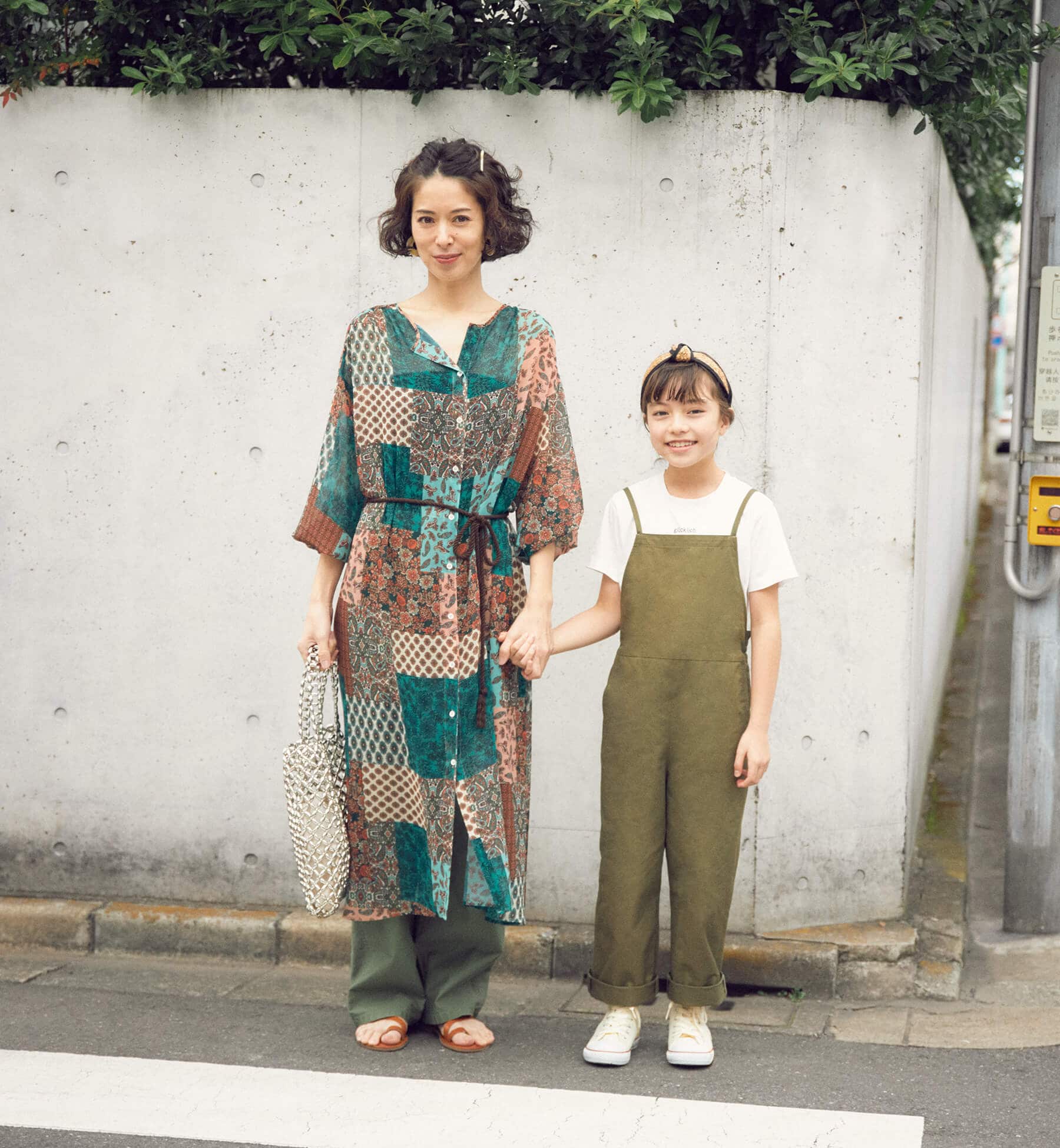 昼下がりの子どもとのお出かけは、ラクでありつつも着映えのするパッチワークプリントのワンピースを主役に。ベイカーパンツをレイヤードした遊び心のあるカジュアルスタイルが今旬です。ワンピースはポリエステル素材でシワになりにくく、お手入れも楽チンなので急な公園遊びにも安心。