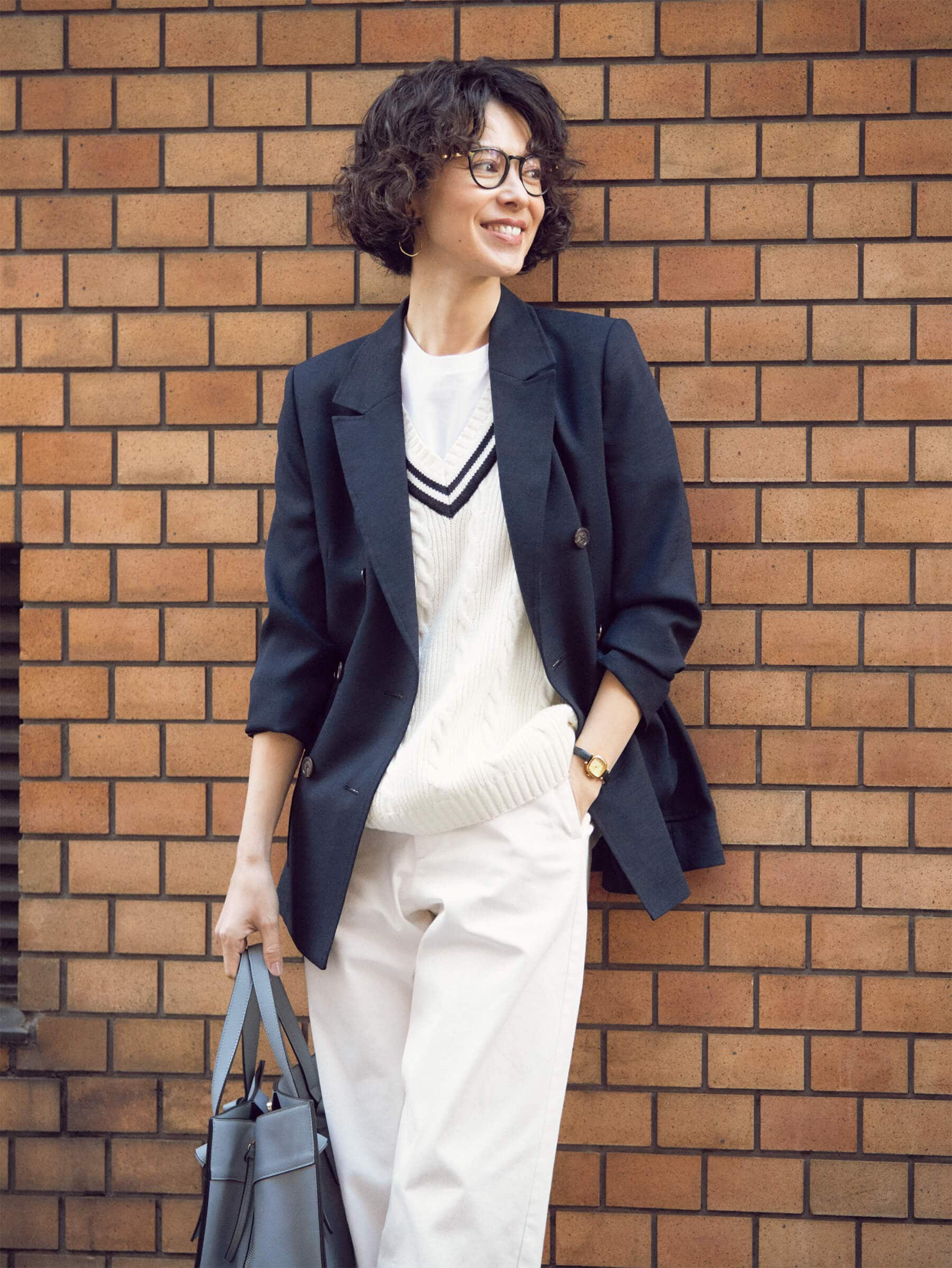 ジャケット¥16300・チルデンニットベスト¥8600・バッグ¥6300(シップス エニィ)・白Tシャツ¥1800(シップス エニィ×ヘインズ)・パンツ¥12700(シップス エニィ×グロウンアンドソーン)・ピアス¥5400(ドソン)・時計¥7800(コモノ)/シップス エニィ プレス メガネ/スタイリスト私物