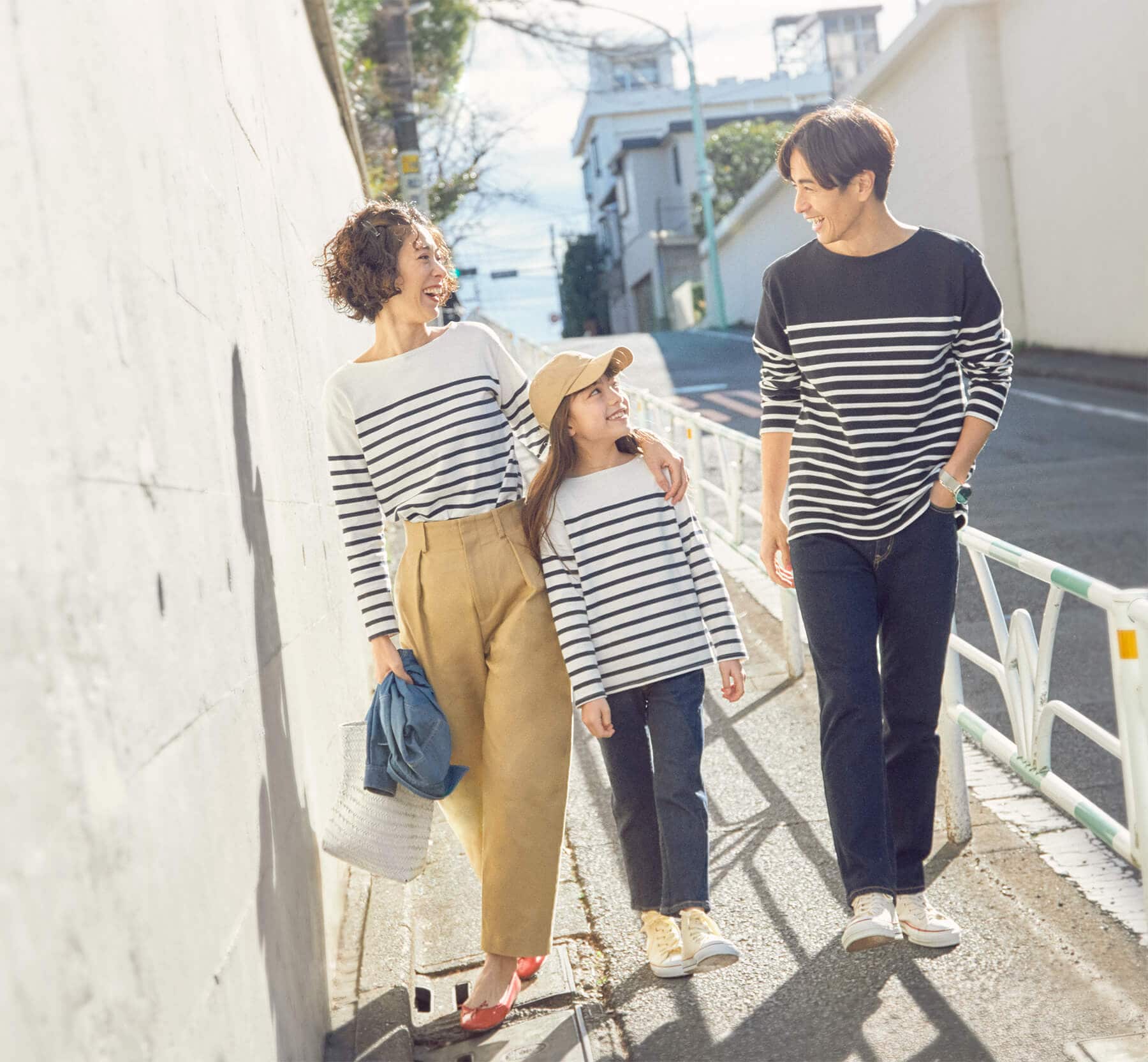 ママはトップスをチノパンにすっきりとINさせて、赤のバレエシューズを合わせ、フレンチシックに。パパ&キッズはデニムパンツとキャンバススニーカーで爽やかカジュアルに。ボーダーの配色や小物使いでそれぞれアレンジを加えることで、楽しく自分らしい家族スタイルを完成させて。